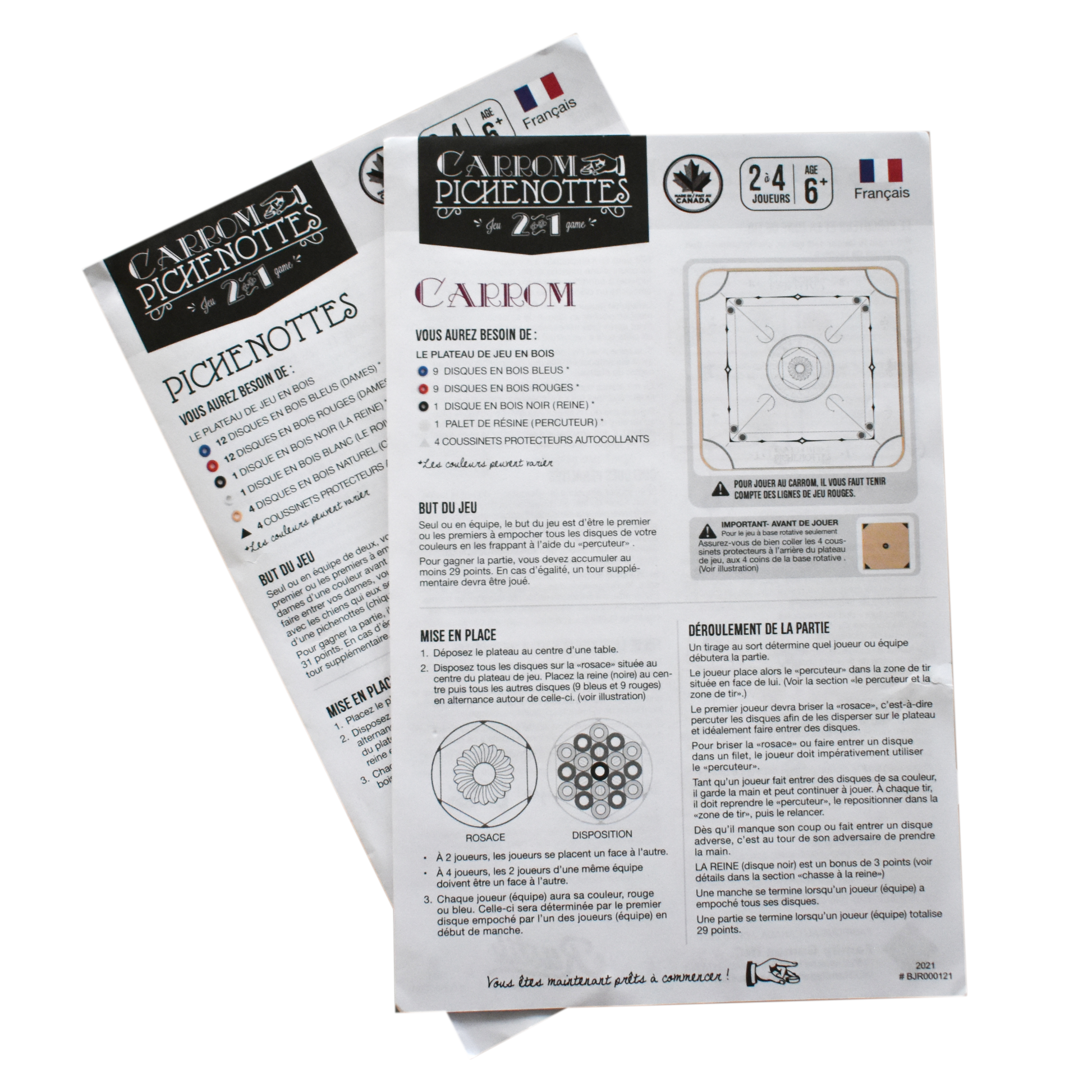 This is a beginner carrom board (handmade in Quebec, Canada) that is 30.75 inches and has a playing surface of 29 inches. The American-style carrom board has wide pockets (6"x 3.5") which make it easier to shoot into the corner holes. It comes with an abundance of carrom / pichenotte rings (including a drawstring pouch), sliding powder, and 2 optional carrom cues and a 12 inch lazy susan.